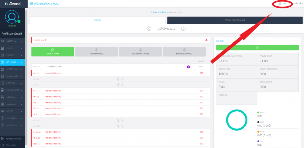 Z výkazu zamestnanca, ktorý máte otvorený, môžete tlačiť aj priamo.