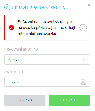 a následne zvolíte novú pracovnú skupinu a dátum od ktorého má byť zamestnanec v tejto pracovnej skupine zaradený. Následne sa Vám zobrazí hláška: „Priradenie na pracovné skupiny sa na úväzku prekrývajú, alebo siahajú mimo platnosti úväzku“.