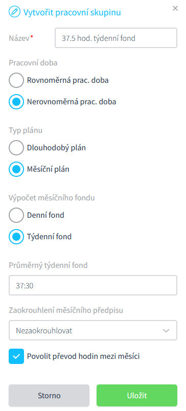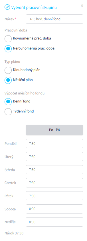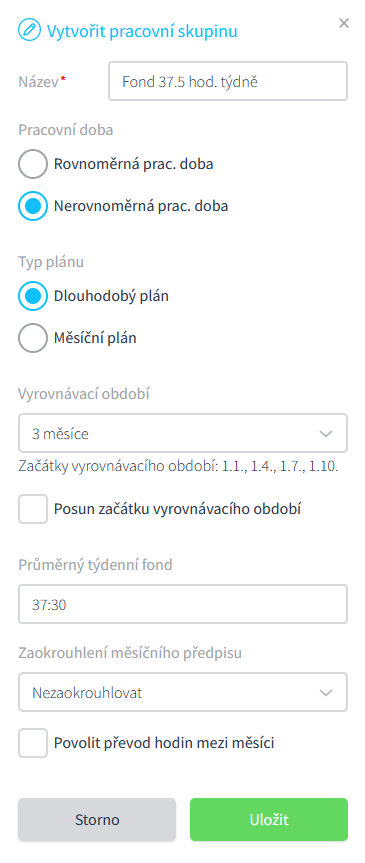 Pri vytváraní novej pracovnej skupiny zadajte Názov, ďalej voľby Nerovnomerná prac. doba, Mesačný plán a Týždenný fond.