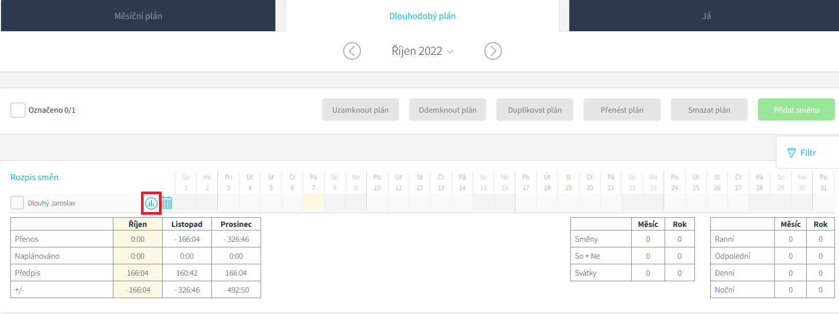 Začnite tým, že na záložke Dlhodobý plán naplánujete smeny na celé vyrovnávacie obdobie, ktoré ste zadali v nastavení pracovnej skupiny. Pre kontrolu, či sú smeny zadané v súlade s Predpisom slúži tlačidlo štatistika. Štatistika vám ukáže Predpis na každý mesiac, koľko ste naozaj na daný mesiac naplánovali a aké je +/-, teda rozdiel medzi Predpisom a naplánovanými smenami. Súčet naplánovaných smien v každom mesiaci sa stáva aj mesačným fondom zamestnanca.