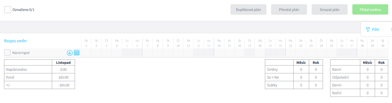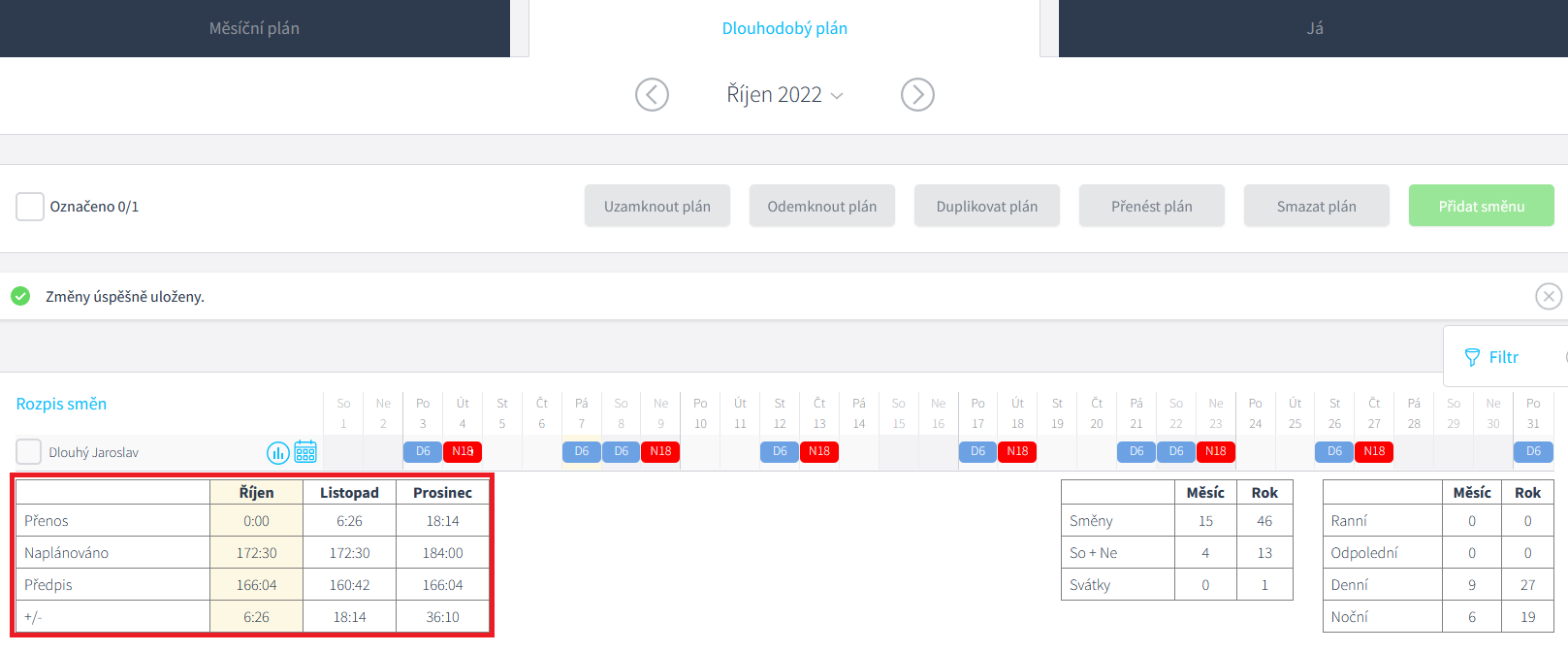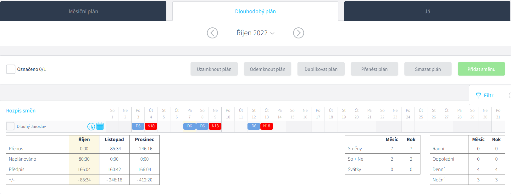 Rovnako ako v predchádzajúcej časti môžete využiť mesačný plán a naplánovať každý mesiac podľa potrieb. V štatistike pri plánovaní máte informáciu o Fonde (čiže automaticky vypočítaný Predpis na daný mesiac), o súčte Naplánovaných smien ao +/-, teda rozdielu medzi súčtom Naplánovaných smien a Fondu.