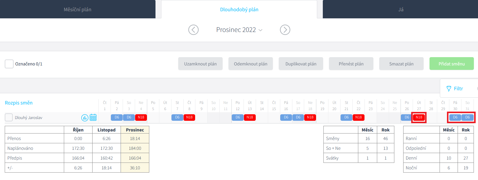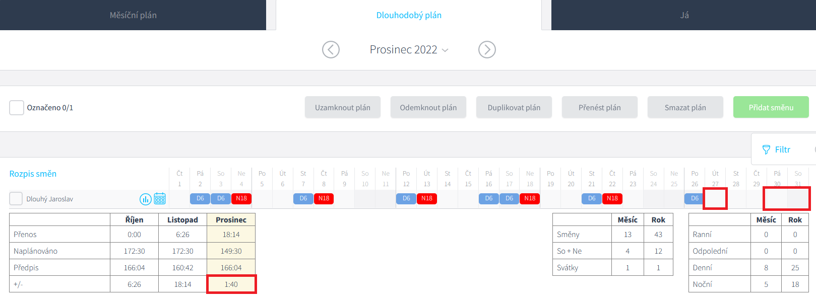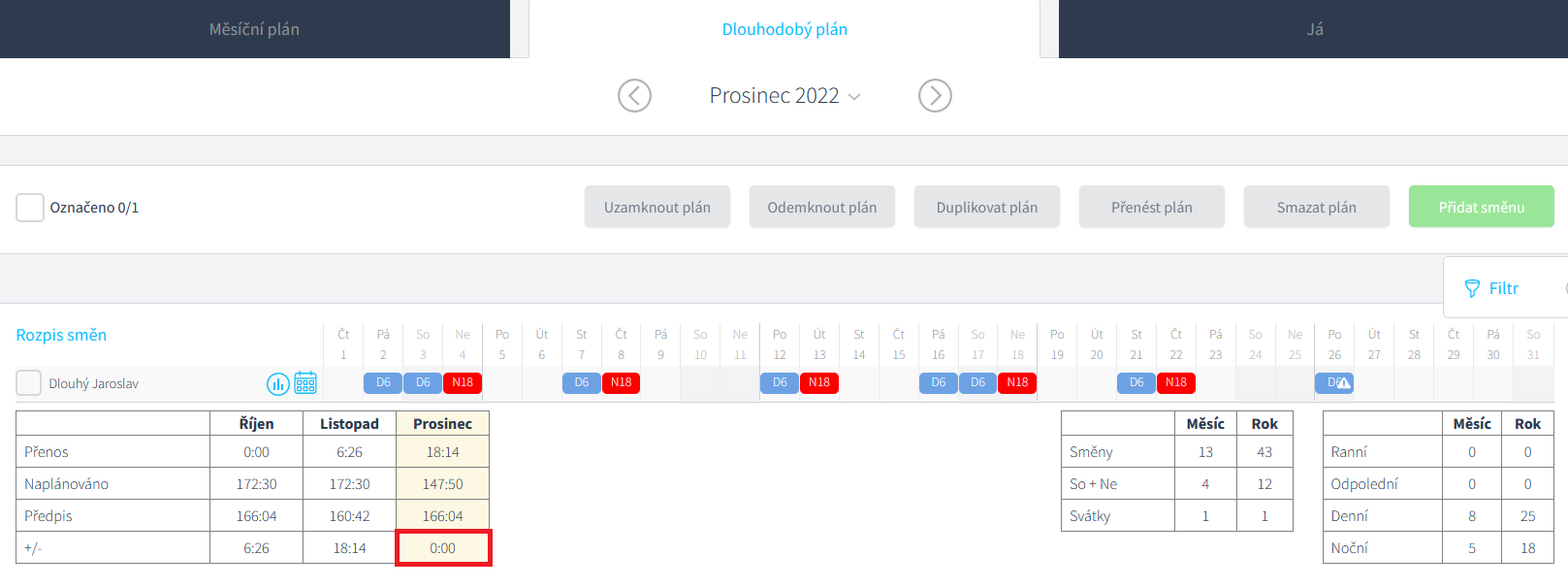 Posledným krokom je, že musíte dlhodobý plán upraviť tak, aby na konci vyrovnávacieho obdobia bolo v políčku +/- 0:00. Vzhľadom na to, že pán Dlouhý pracuje na 11:30 hodín denne (počíta sa doba bez prestávok), je potrebné mu z plánu odstrániť 3 celé smeny a ešte "kúsok" smeny štvrtej. Z výkazu v decembri je teda potrebné 3 zmeny zmazať (nemusí to byť len v decembri, ale kedykoľvek v priebehu vyrovnávacieho obdobia, ale pre náš príklad bude december prehľadnejší).
