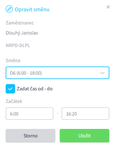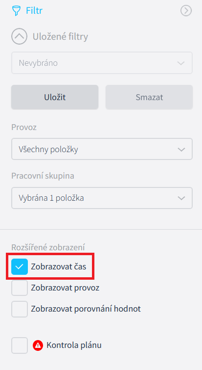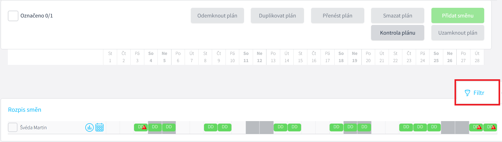 V prípade, že v pláne potrebujete vedľa skratiek smien vidieť aj presné časy, od kedy do kedy je smena naplánovaná, môžete si cez Filter zatrhnúť voľbu Zobrazovať čas a následne bude čas zobrazený pri každej smene priamo v pláne.