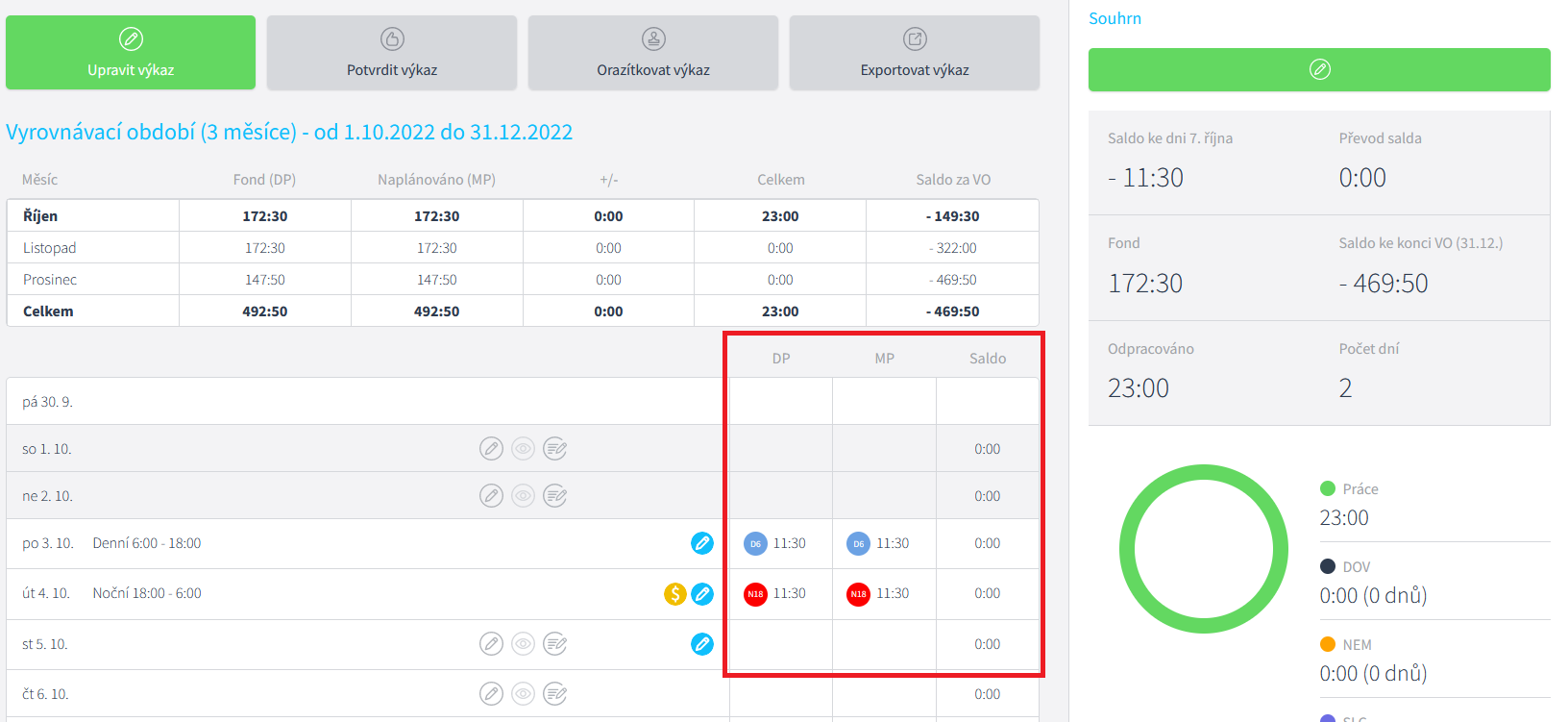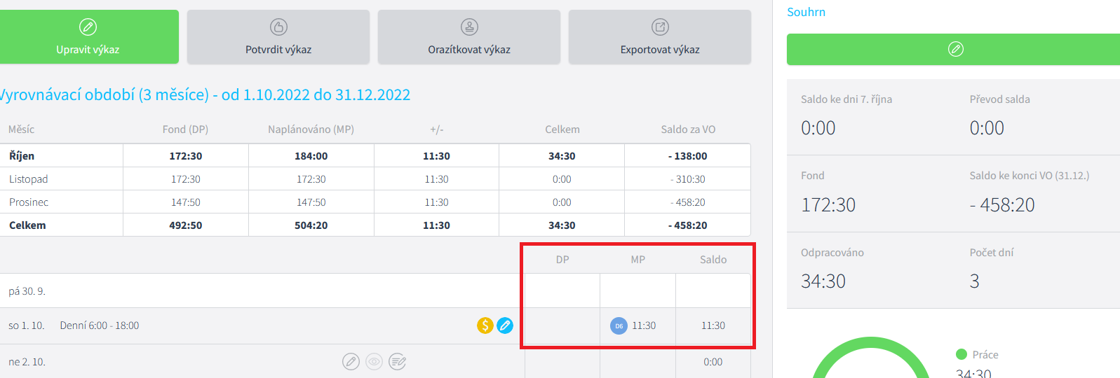 (Príklad: Zamestnanec pracuje na NRPD s VO na 2 mesiace a tu sú súhrny za september 2022 a október 2022 k dátumu 27. 10. 2022. Za september 2022 má zamestnanec v salde 11:30 hod. navyše, ale k 27.10. ku koncu VO -15:03, pretože má ešte v pláne smeny na 28.10-30.10., celkové saldo za celé VO bude možné vyhodnotiť až po smene 30.10.2022).