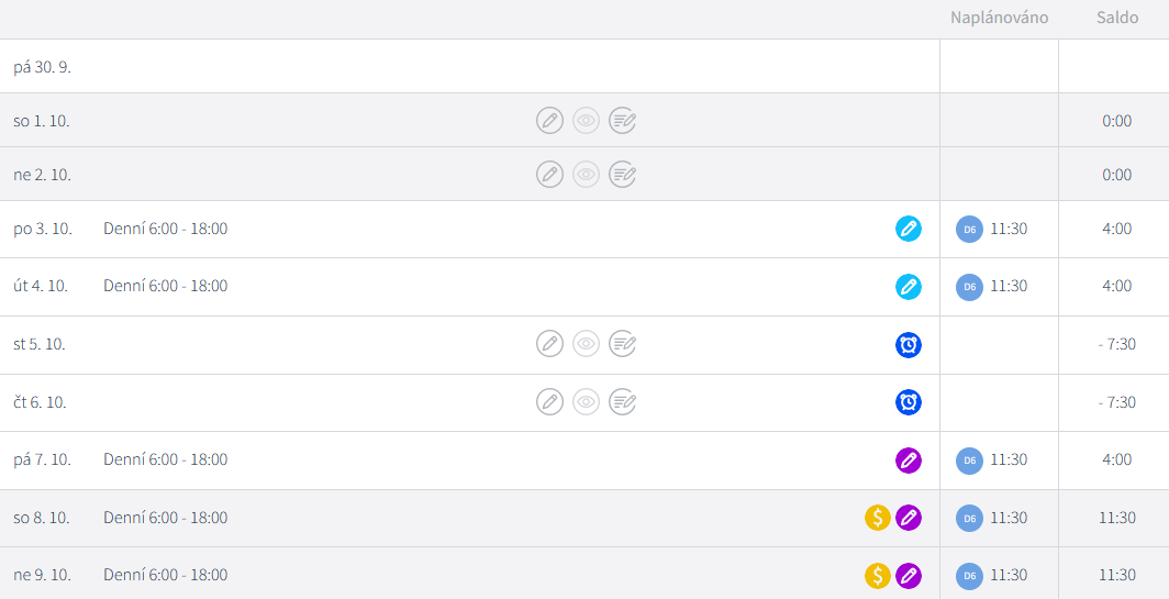 Takto nastavená pracovná skupina znamená, že Alveno uvidí naplánovaný fond na pracovné dni (a vďaka tomu dokáže vypočítať mesačný fond), ale zamestnanec bude chodiť nepravidelne. To ale spôsobí nesúlad vo výkaze zamestnanca v stĺpci Saldo a preto pri tejto možnosti máte umožnené si stĺpec Saldo skryť. (Príklad: Zamestnanec chodí na smeny o dĺžke 11:30 hod. a tieto smeny má rozvrhnuté nerovnomerne na krátky dlhý týždeň. Zamestnávateľ ale nechce jeho mesačný fond vypočítať štandardne pre NRPD, chce ho podľa plánovacieho kalendára. Preto do pracovnej skupiny zadá hodnotu 7: 30 hod. na pondelok - piatok. Následne potom takto vyzerá výkaz zamestnanca a je dobré skryť stĺpček Saldo, pretože takto vyzerajúci výkaz môže byť mätúci).