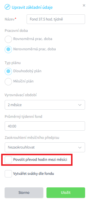 V nižšie uvedených riadkoch sa budeme baviť o dvoch funkciách, ktoré budú rôzne nastavené pre rôzne možnosti nastavenia vysporiadania nadčasov. Jedná sa o funkciu Povoliť prenos medzi mesiacmi, ktorú nájdete v Nastavenia - konkrétna pracovná skupina - sekcia Základné údaje a ďalej sa jedná o funkciu Preplácať saldo, ktorú nájdete v Nastavenia - konkrétna pracovná skupina - sekcia Príplatky.