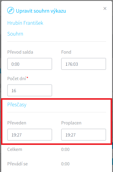 Je z neho jasne zrejmé, že celé VO zamestnanec odpracoval o 19:27 hod. viac, než stanovuje predpis a tieto hodiny má dosť zaplatené ako nadčas. Ako nadčas ich označíte kliknutím na Zelenú ceruzku v súhrne av nasledujúcom okne oných 19:27 zadáte do políčka Nadčasy Prevedený a Nadčasy Preplatený.