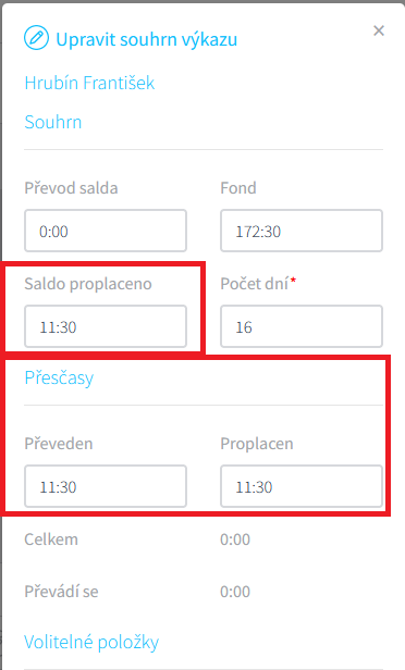 Preplatenie nadčasu v priebehu sa vykonáva rovnako ako vo vyššie uvedenom príklade, akurát hodnotu preplácaného nadčasu je nutné zadať aj do políčka Saldo preplatené (ak to neurobíte, nebude preplatený nadčas odpočítaný a na konci VO by ste ho preplatili znova).