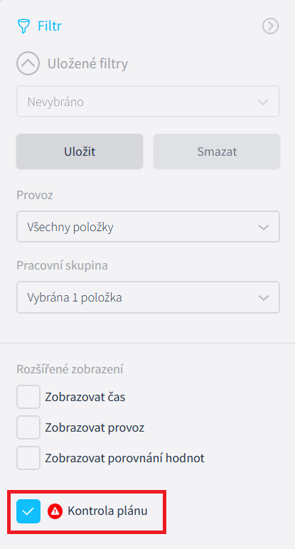 Kontrola plánu môže tiež prebiehať automaticky na pozadí a upozorniť vás na problém už počas plánovania. Automatickú kontrolu plánu zapnete na karte Dlhodobý plán alebo Mesačný plán a to cez Filter a následne zaškrtnutím voľby Kontrola plánu.