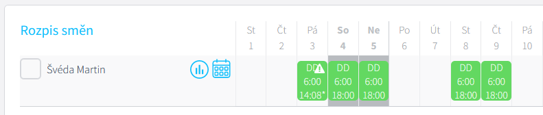 Príklad: Pán Dlhý pracuje ako vrátnik na dvanásťhodinové smeny a má vždy dlhý a krátky týždeň. Naplánujeme mu teda teraz smeny na prvých štrnásť dní v mesiaci a to tak, že vyberieme dni, v ktorých chceme, aby chodil do práce. Pozn. Všimnite si, že sa okamžite začala vypĺňať štatistika.