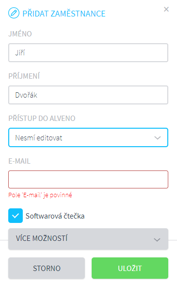 Vyplnenie e-mailu je povinné, pretože program na tento e-mail zamestnancovi zašle odkaz a po kliknutí na daný odkaz ho vyzve na vytvorenie vlastného hesla. A v okamihu keď to vykoná, bude už môcť k dochádzke pristupovať odkiaľkoľvek cez webový prehliadač.