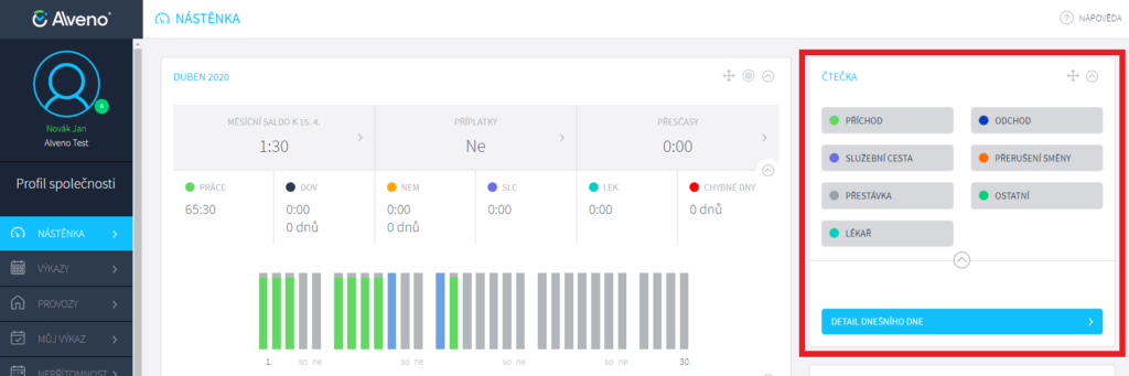 Softvérová čítačka – Keď je táto možnosť zaškrtnutá, tak zamestnanec má na svojej Nástenke na pravej strane „virtuálnu dochádzkovú čítačku“ priamo v programe a po prihlásení si môže svoju dochádzku zaznamenávať odkiaľkoľvek.