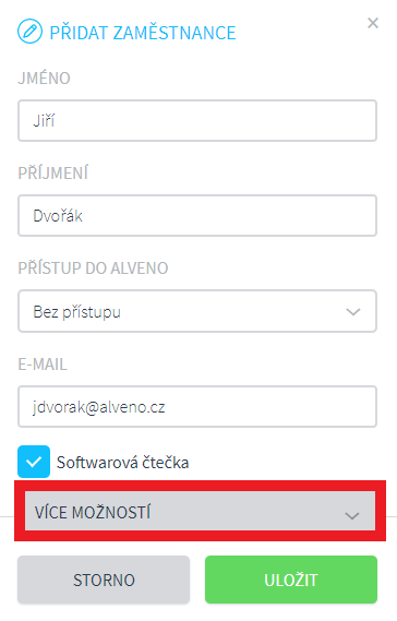 Prístup do Alveno. V predvolenom nastavení je voľba Bez prístupu. To znamená, že zamestnanec nemá žiadnu možnosť sa do programu pozrieť. V prípade, že mu chcete umožniť prístup do programu k jeho dochádzke, tak v rolovacom menu zvolíte jednu z dvoch možností: Nesmie editovať a Smie editovať. Variant Nesmie editovať znamená, že zamestnanec bude mať náhľad na svoju dochádzku, ale nebude môcť si ju nijako upravovať. Pri variante Smie editovať bude mať možnosť si svoju dochádzku tiež upravovať. Akonáhle jednu z týchto dvoch možností zvolíte, program od Vás bude vyžadovať e-mail zamestnanca.