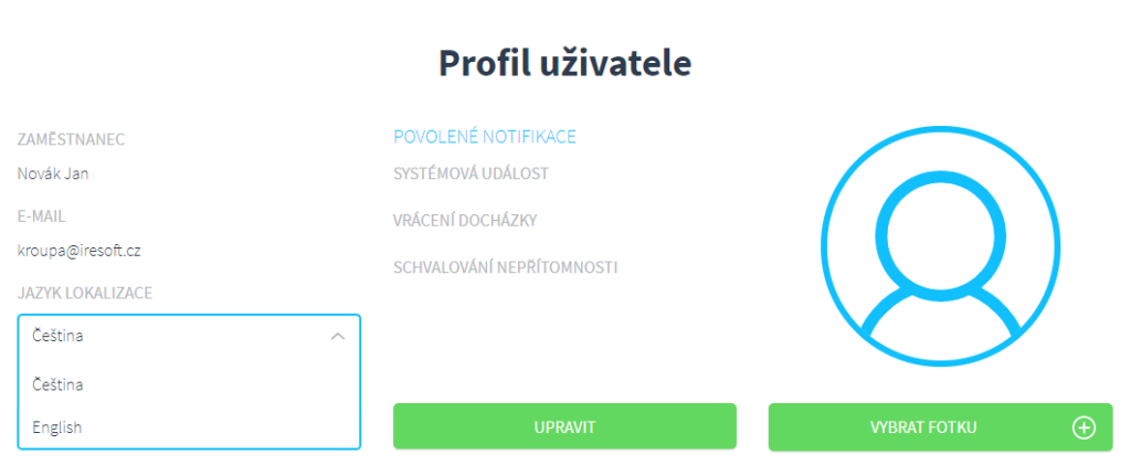 Jazyk lokalizácie – ako východisková je nastavená slovenčina, ktorá sa nedá zmeniť. Až je účet zamestnanca aktívny, tak po prihlásení do programu je v ľavom hornom rohu Profil užívateľa