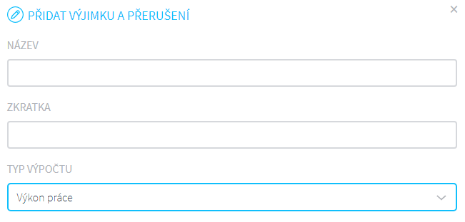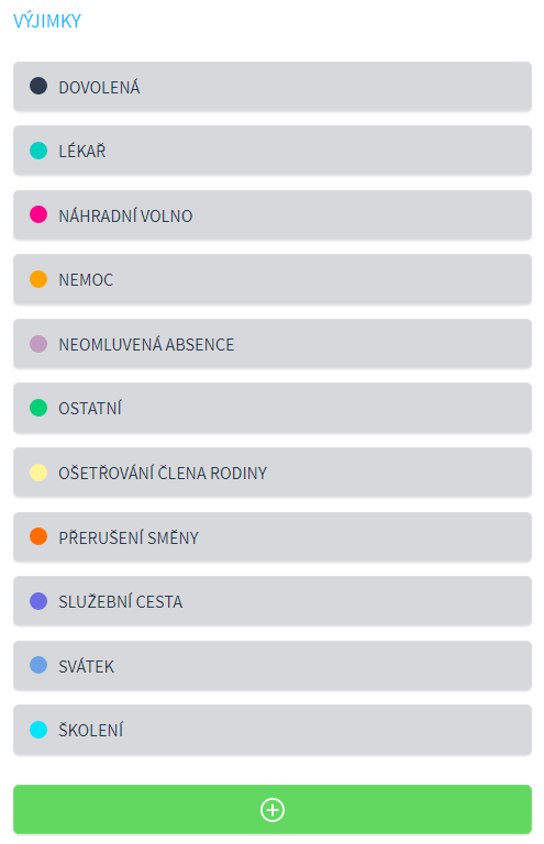 Výnimky sú dôvody neprítomnosti zamestnanca (dovolenka, pracovná neschopnosť atď.) Tie najbežnejšie dôvody sme pre vás už prednastavili, ale pokiaľ budete potrebovať, môžete si nastaviť podľa vašich potrieb ďalšie.