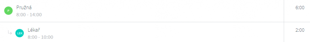 Zamestnanec má nastavenú základnú pracovnú dobu v pružnej smene alebo začiatok pevnej smeny od 08:00 avšak do práce prišiel od lekára o 10:00, program mu teda automaticky dopočíta dobu strávenú u lekára.