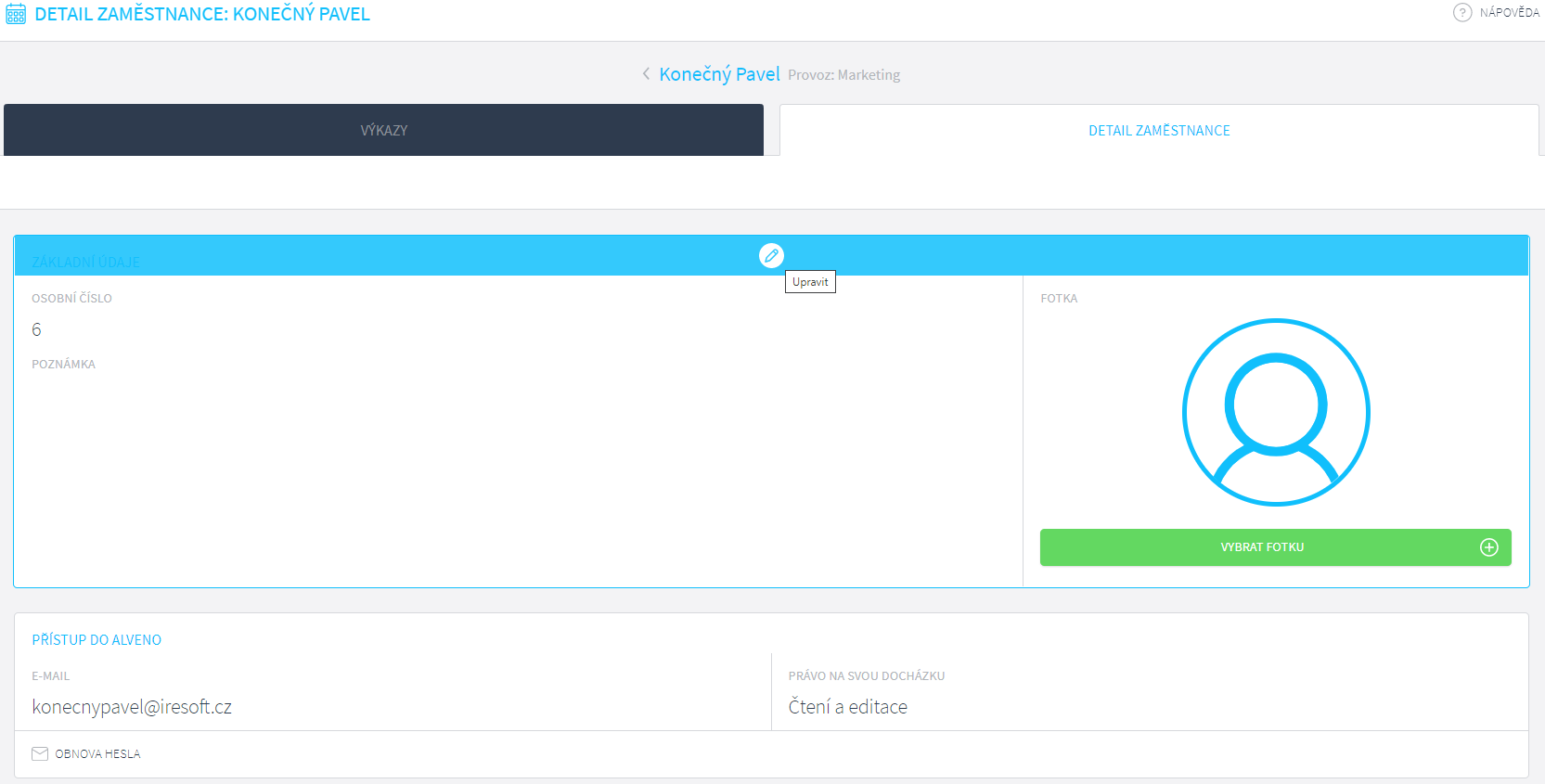 V okamihu, keď už máte v programe Alveno vytvoreného zamestnanca, tak k nemu môžete vložiť fotografiu, dopísať podrobnejšie informácie ako sú tituly, poznámka, atď.
