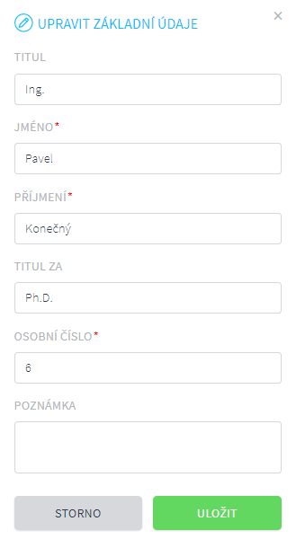 V tejto časti môžete opraviť ako chybne zadané osobné číslo, chybne zadané meno, zapísať poznámku a tiež vložiť titul pred a za meno tohto zamestnanca.