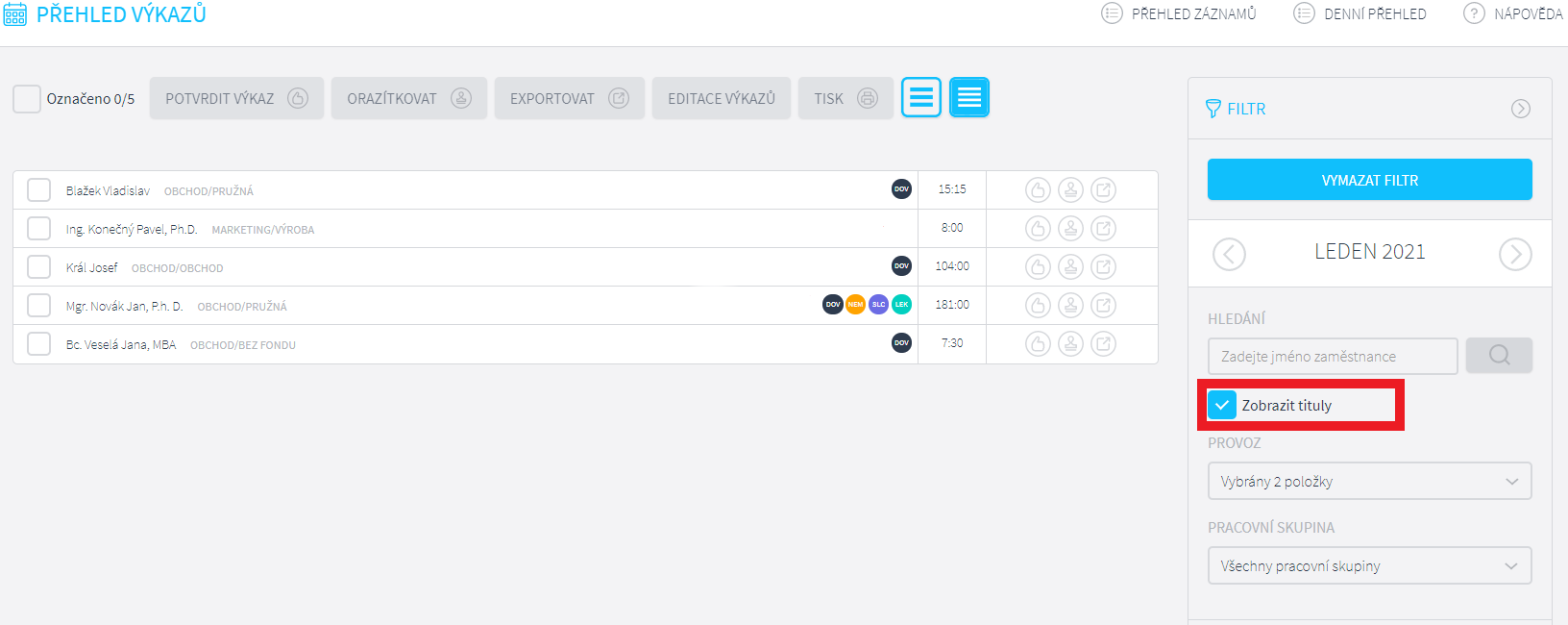 V sekcii Výkazy je na pravej strane filter a tu je zaškrtávacie políčko s názvom "Zobraziť tituly". Pokiaľ je zaškrtnuté, tak sa v zozname budú zamestnanci zobrazovať aj vrátane titulov.