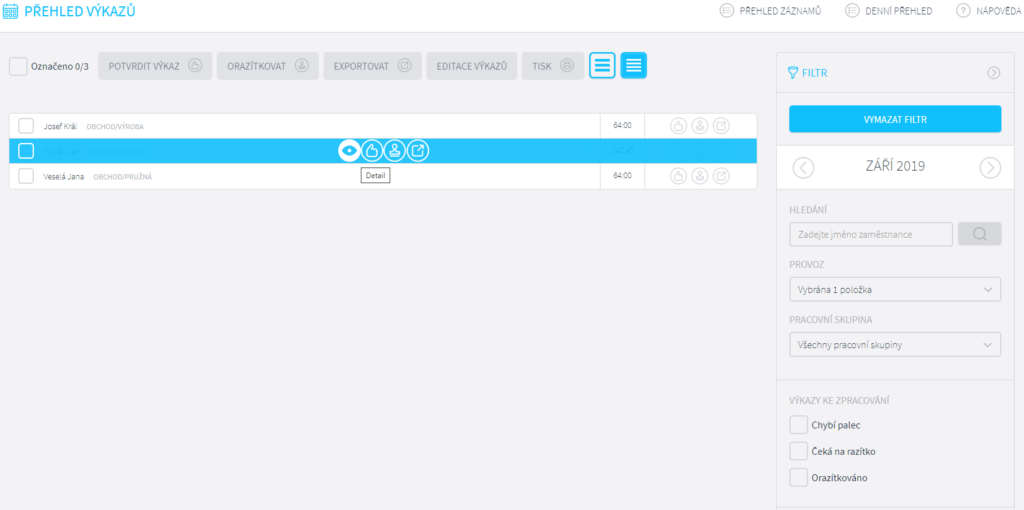 V prehľade výkazov nabehnete myšou na osobu, ktorej chcete ručne uznávať nadčasy a kliknete na symbol oka.