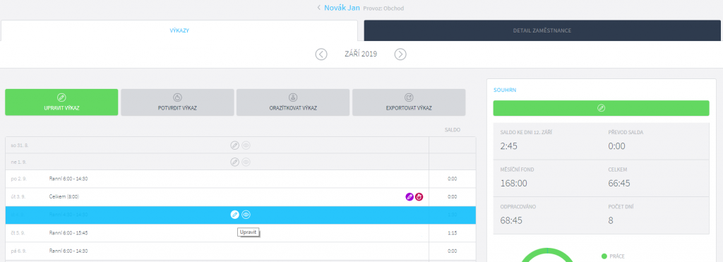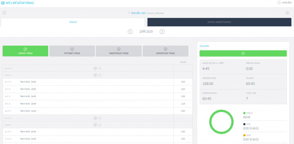 Zobrazí sa Vám detail výkazu zamestnanca, v ktorom sú už automaticky vypočítané smeny.