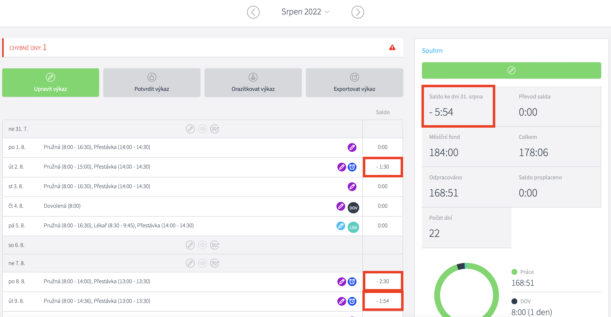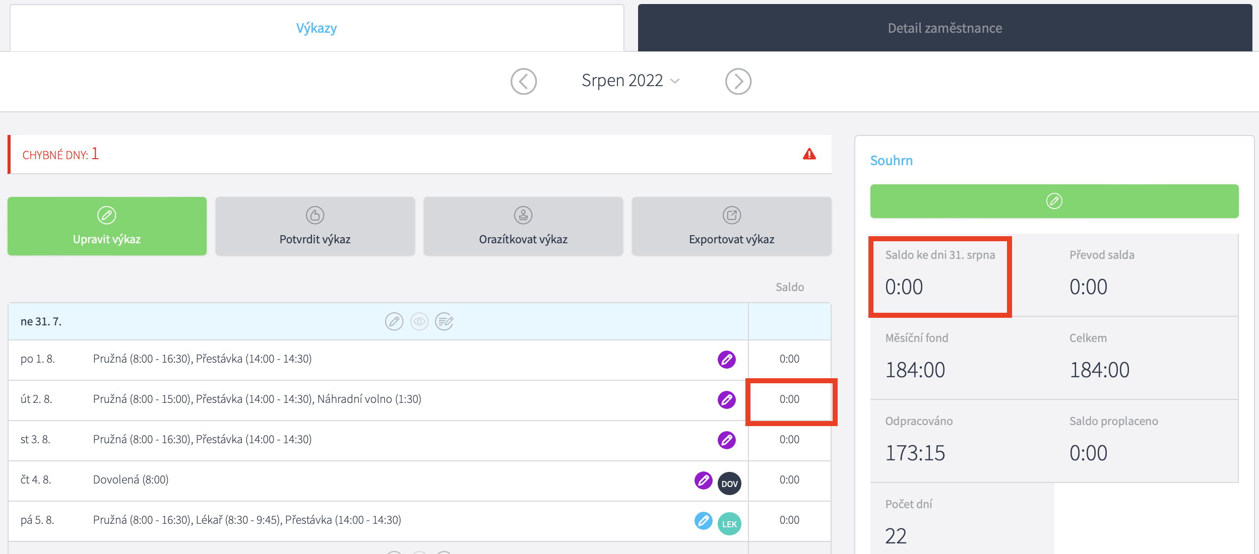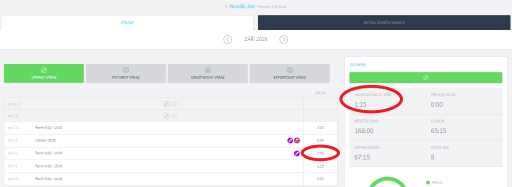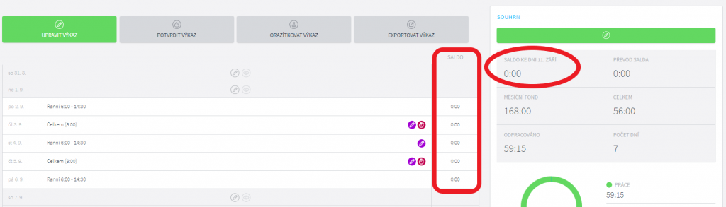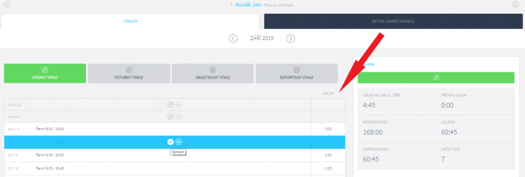 Na pravej strane výkazu máte stĺpec Saldo. Je to hodnota, ktorá Vám ukazuje rozdiel medzi tým, koľko hodín mal človek odpracovať a koľko reálne odpracoval. Na Vašom uvážení je potom, či mu toto saldo uznáte ako nadčas, alebo zamietnete.
