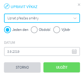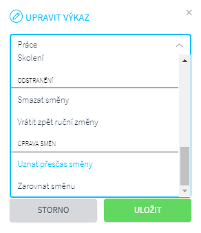 Následne sa Vám aktivuje možnosť Upraviť výkaz a v rolovacom menu vyhľadáte možnosť Uznať nadčas smeny.