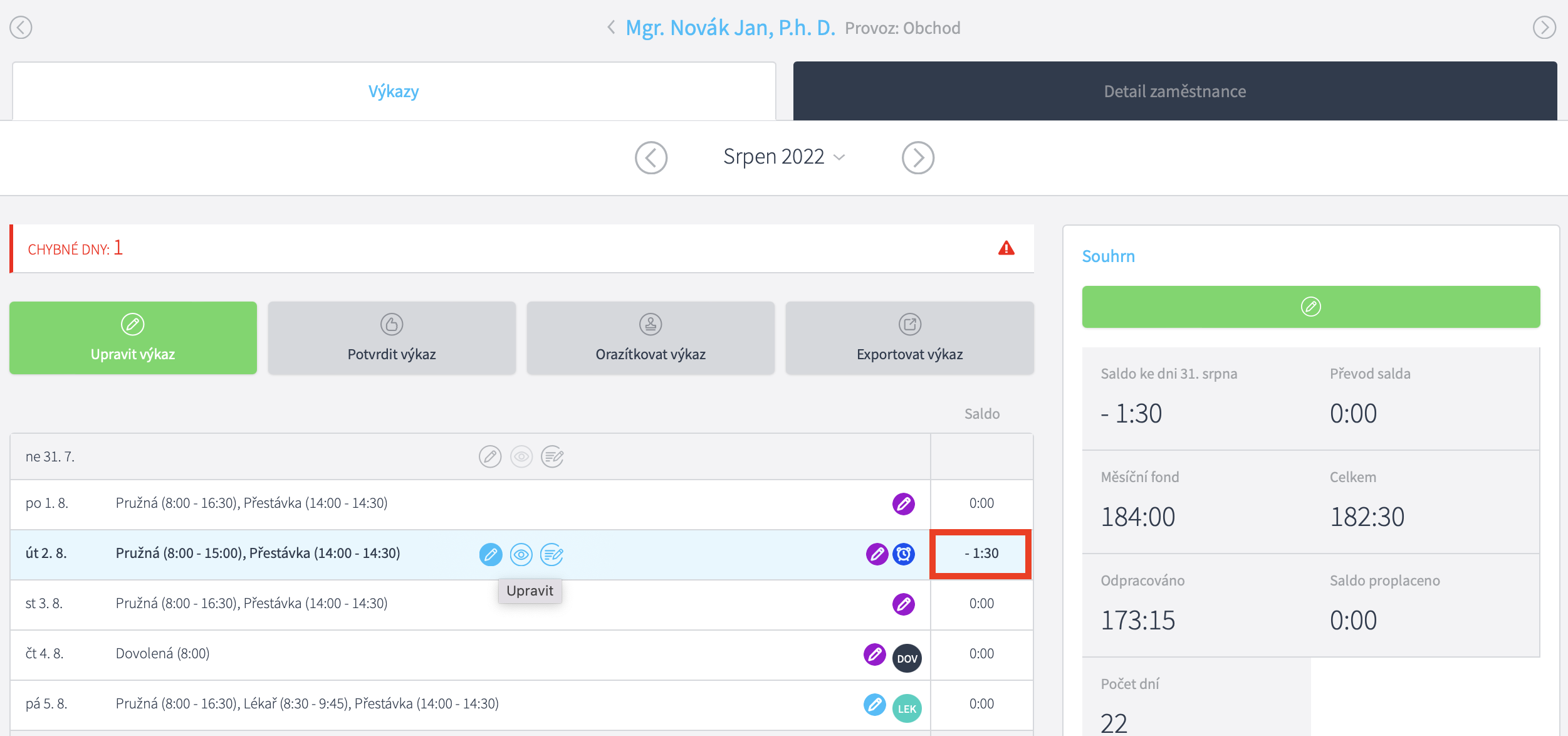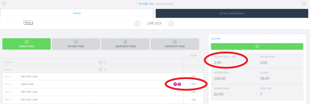 Nadčas uznáte tak, že nabehnete myšou na deň, ktorý má kladné saldo a zvolíte symbol ceruzky.