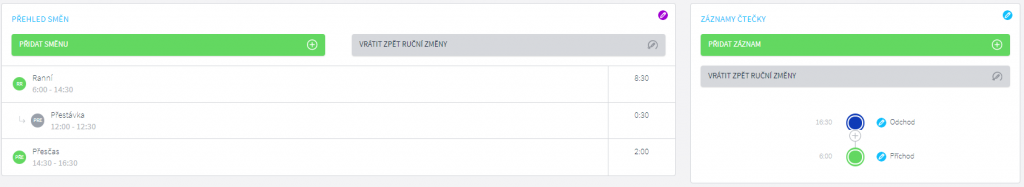 V detaile dňa potom vidíte smenu ohraničenú začiatkom a koncom pracovného času a následne Nadčas, ktorý je tiež ohraničený začiatkom a koncom trvania práce nadčas.