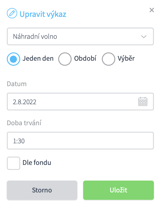 O tú hodnotu náhradného voľna, ktorú zadáte do výkazu, sa vám poníži počet nadčasových hodín a naopak sa dorovná mínusové saldo do nuly.