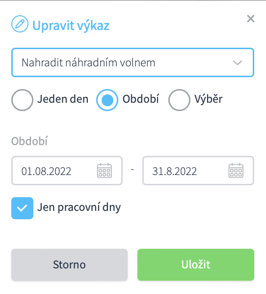 Prejdite myšou na akýkoľvek deň a kliknite na symbol ceruzky. Následne sa Vám aktivuje možnosť Upraviť výkaz av rolovacom menu vyhľadáte možnosť Nahradiť náhradným voľnom. Ako obdobie zvoľte napríklad rozsah celého mesiaca a potvrďte tlačidlom Uložiť.