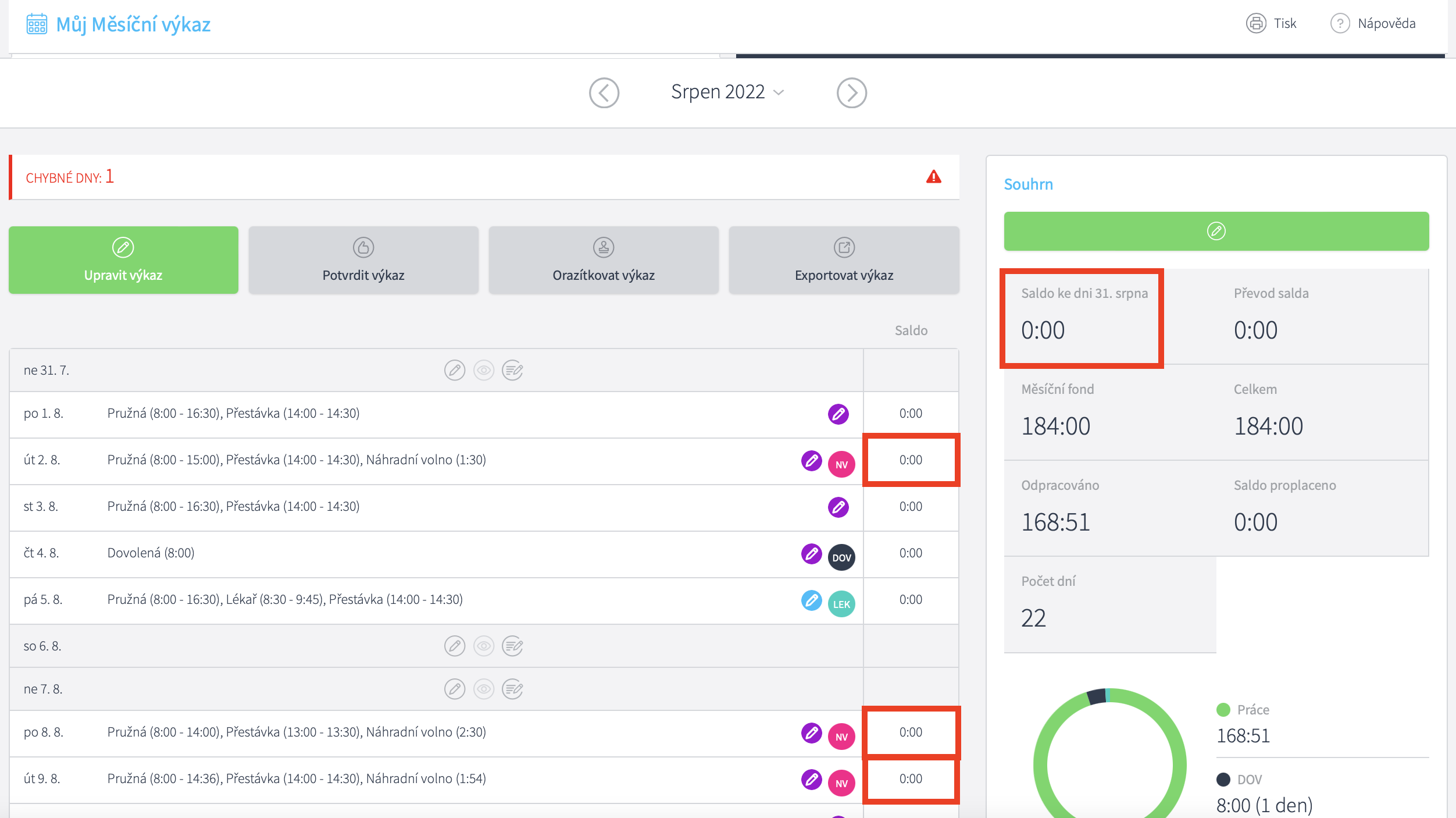 V ideálnom prípade, by pri ručnom uznávaní nadčasov a zarovnávaní smien, mal mesačný výkaz vyzerať tak, že v každom dni bude saldo rovné 0:00 a tiež celkový Súhrn mesiaca bude mať hodnotu 0:00, pretože všetky nadčasy sú buď uznané alebo zamietnuté.