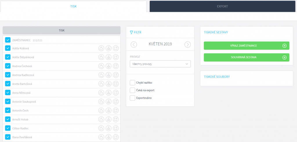 Na ľavej strane sa Vám zobrazí zoznam zamestnancov. Začiarknuť môžete buď konkrétnych zamestnancov alebo všetkých zamestnancov, ktorým chcete vytlačiť výkaz alebo tlačovú zostavu.