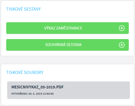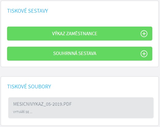 Keďže vytváranie mesačných výkazov alebo tlačových zostáv pre väčšie množstvo zamestnancov môže chvíľku trvať, tak uvidíte na pravej strane v položke Tlačové súbory informáciu o tom, že Vaša tlačová zostava sa vytvára.