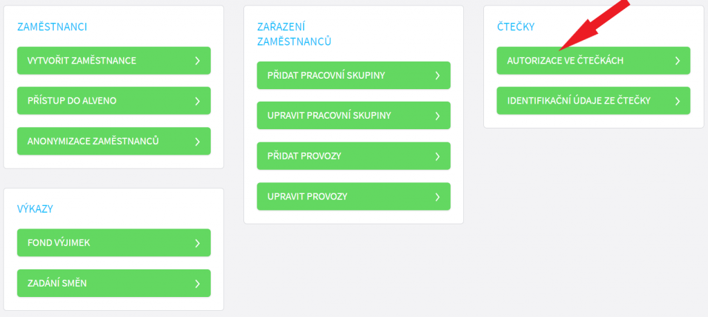 Po prístupe je sekcia rozdelená na kategórie Zamestnanci, Zaradenie zamestnancov, Čítačky a Výkazy.