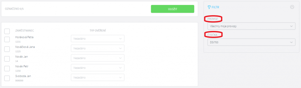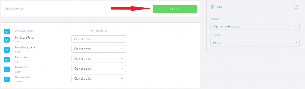 Teraz už v zozname zamestnancov na ľavej strane zvoľte zamestnancov, ktorých chcete mať autorizovaných v dochádzkovej čítačke a voľbu potvrdíte tlačidlom Uložiť.