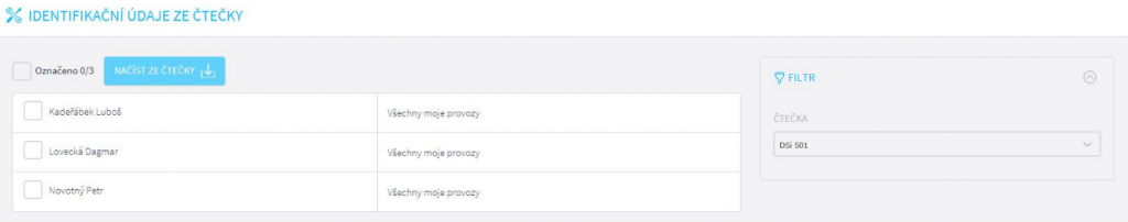 Pokiaľ máte viac čítačiek, tak vo filtri na pravej strane vyberiete tú čítačku, z ktorej chcete stiahnuť identifikačné údaje zamestnancov (ako sú odtlačky prstov a čipy). Na ľavej strane sa Vám zobrazia všetky osoby, ktoré sú v čítačke autorizované. Potom už len „zaklikáte“ osoby, ktorým chcete uložiť identifikačné údaje do cloudu a potvrdíte tlačidlom Načítať z čítačky.